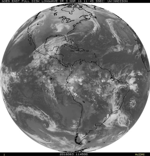 Figure 7. Radiation with wavelengths close to the 10.7 µ (1µ = 10-6m), as observed with a geostationary satellite over the western hemisphere of the Earth.[23] This is radiation in the infrared window of Fig. 4, where the surface can radiate directly to space from cloud-free regions.