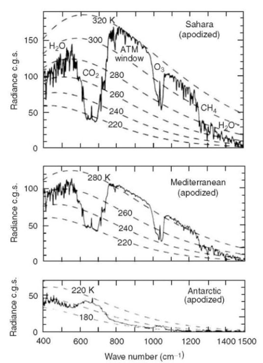 Figure 8. Spectrally resolved, vertical upwelling thermal radiation I from the Earth, the jagged lines, as observed by a satellite.[28] The smooth, dashed lines are theoretical Planck brightnesses, B, for various temperatures. The vertical units are 1 c.g.s = 1 erg/(s cm2 sr cm-1) = 1 mW/(m2 sr cm-1).